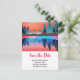 Carte postale pour enregistrer la date avec un beau design graphique représentant un lac paisible avec des cerfs. et de grands pins se reflétant dans l'eau. Des étoiles planent au-dessus.