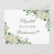 Invitation tes amis et ta famille pour être tes demoiselles d'honneur avec ces élégantes cartes de proposition de demoiselle d'honneur. L'avant présente deux beaux bouquets de roses d'aquarelle blanche, hydrangée et verdure et votre texte écrit dans le script de calligraphie verte de forêt et la typographie serif. Sur le dos, il y a un seul rose d'aquarelle blanc, une branche feuillue et votre message de proposition. Conçu dans le cadre de notre collection traditionnelle de mariages Megan. N'oubliez pas de parcourir les autres produits pour créer un look coordonné et élégant pour votre mariage. Si vous avez besoin d'aide pour customiser cette carte ou si vous voulez que je crée des produits supplémentaires et correspondants, veuillez me contacter à admin@albamarie.com . Je serais heureux d'aider !