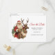 Enregistrez la carte postale de la date avec une illustration de Noël amusante. Le Père Noël dans son costume rouge traditionnel chevauchant un grand renne en berger décoré de saint. Un sapin de Noël à l'arrière.