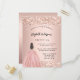 Une invitation moderne, élégante et glamour pour une fête Sweet 16, 16e anniversaire. Un arrière - plan rose en or avec de la poussière de parties scintillant en faux or, une fille portant une robe de bal. Le nom est écrit avec un script de style moderne écrit à la main. Personnalisez et ajoutez les détails de votre fête.