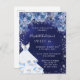 Une invitation moderne, élégante et glamour pour une fête Sweet 16, 16e anniversaire. Un arrière - plan de marine avec des étincelles de parties scintillant faux argent, une robe et des roses bleus, des fleurs. La couleur bleue de l'arrière - plan est inégale. Le nom est écrit avec un script de style moderne écrit à la main. Personnalisez et ajoutez les détails de votre fête.