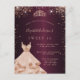 Une invitation moderne, élégante et glamour pour une fête Sweet 16, 16e anniversaire. Un arrière - plan à l'allure métallique bordeaux profond avec parties scintillant en faux or rose, une robe de ballon en or rose et une tiare. Le nom est écrit avec un script de style moderne écrit à la main. Personnalisez et ajoutez les détails de votre fête. Conseil : Si vous ne voulez pas qu'il ressemble à une carte postale, cliquez sur customiser, allez à l'arrière et retirez le séparateur et le timbre postal.