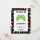 Carte postale Invitation Anniversaire de enfant Gamer Niveau de partie vidéo. Ajoutez le nom et l'âge à la mise à niveau de ces fournitures de partie de joueur. Motif amusant de jeux vidéo et des collations sur l'arrière - plan noir. Gamer party for kids. www.SamAnnDesigns.com