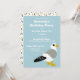 Ces invitations personnalisables à des fêtes comportent une illustration de dessin animé d'une mouette. L'oiseau est blanc, gris, noir et orange et dressé contre un arrière - plan bleu clair. Les détails de votre fête apparaissent en lettres blanches. L'envers a un imprimé de confettis coordonné pour un look amusant et festif.