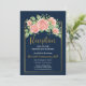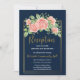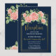 Carton d'invitation de réception floral en bleu marine et or rose.