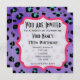 Un carton d'invitation idéal pour un anniversaire ou toute autre occasion. Fond imprimé léopard violet sur les deux côtés. Le recto comporte un texte noir personnalisable à l'intérieur d'un cadre à crochets rose.