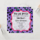 Un carton d'invitation idéal pour un anniversaire ou toute autre occasion. Fond imprimé léopard violet sur les deux faces. La face avant comporte un texte personnalisable noir à l'intérieur d'un cadre à crochets rose.
