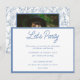Ces Cartons d'invitation à une Bat Mitzvah Florale Française Bleue Elégante comprennent l'option de personnaliser entièrement tous les titres et textes. Le recto comprend du texte bleu et le verso présente un élégant design floral français toile bleue ainsi que la photo de votre Bat Mitzvah. Entrez dans l'outil de conception Zazzle pour des personnalisations de conception supplémentaires.