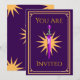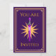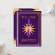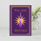 Invitation d'anniversaire à l'épée violette magique parfaite pour un héros de 5 ans. Idéal pour les fêtes sur le thème de guerrier de fantasy et les célébrations épiques d'enfants. Texte modifiable pour le nom, la date et les détails de la fête.