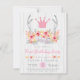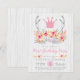 Carton d'invitation pour baby shower tribal fille avec des bois floraux rustiques rose et or et une bannière avec une couronne de paillettes rose sur un fond en bois blanc. Vous pouvez facilement personnaliser ce carton d'invitation de baby shower tribal boho rustique pour votre événement en ajoutant simplement vos détails. Il s'agit d'une conception imprimée sans véritable paillettes, etc.