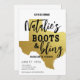 Réalisez les rêves d'enterrement de vie de jeune fille au Texas de la future mariée avec ce magnifique carton d'invitation Boots & Bling. Mettez l'accent sur la future mariée avec son design glamour noir et or et la carte dorée du Texas, prête à faire la fête !