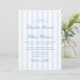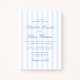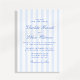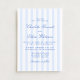 Cette invitation de mariage présente un motif à rayures verticales bleues et blanches douces associé à une typographie script élégante. Le design classique à rayures donne à l'invitation un aspect intemporel et raffiné, tandis que la palette de couleurs bleu clair la garde fraîche et moderne. La combinaison de rayures nettes et de lettrage script fluide crée un style équilibré qui se sent à la fois traditionnel et moderne.
