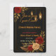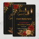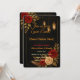 Une carte d'invitation de luxe élégante présentant un fond noir profond encadré de bordures dorées métalliques et d'accents scintillants. Les coins sont magnifiquement décorés de roses aquarellées en rouge riche et ivoire doux, associées à des feuilles dorées pour un effet glamour. Des lanternes dorées suspendues en haut ajoutent une lueur chaleureuse, créant une atmosphère sophistiquée. L'espace central vierge permet une personnalisation complète des détails de votre événement. Parfait pour les mariages, les anniversaires, les galas, les fiançailles ou toute célébration en soirée.