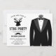Étonnez vos invités avec cette invitation de soirée d'enterrement de vie de garçon au smoking élégant, dotée d'une typographie moderne sur fond blanc. Ajoutez simplement les détails de votre événement sur ce modèle facile à utiliser pour en faire une invitation unique. Retournez la carte pour révéler un motif de rayures noires et blanches au verso.