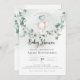 Un petit éléphant mignon sur une balançoire de branche d'eucalyptus. Ce carton d'invitation pour baby shower présente des aquarelles dessinées à la main et des polices modernes.