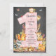 Joli carton d'invitation pour le premier anniversaire d'une fille thème forêt en bois avec un grand numéro un rose entouré d'animaux de la forêt, hibou, raton laveur, renard, cerf, élan et hérisson sur un fond de tableau noir populaire.