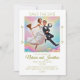 Image drôle d'un couple nouvellement marié tenant un balai et une poêle à frire étant jetés après avoir sauté joyeusement. Une invitation à sauver la date avec une touche d'humour.
