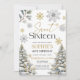 Cartes d'invitation pour un anniversaire Sweet Sixteen avec des flocons de neige et des pins en or et argent. Idéal pour votre fête d'anniversaire des 16 ans en hiver.