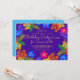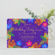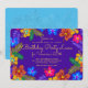 Carton d'invitation pour une fête d'anniversaire Luau violet pour un anniversaire spécial. Une œuvre d'art aux couleurs vives d'hibiscus tropicaux entoure le texte central qui est jaune vif sur fond violet foncé. Le verso est d'une jolie couleur bleu tropical et présente également une impression florale.