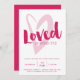 Une invitation pour une fête de la Saint-Valentin à la maison ou à l'église, ou pour un événement pour les jeunes ou les dames de l'église. Ce design typographique moderne présente un cœur rose clair dessiné à la main sur lequel est superposé le mot "Aimé" en police de caractères écrite au pinceau rose fuchsia et la référence des Écritures Jérémie 31:3 sur fond blanc. Le verso est en rose fuchsia uni.