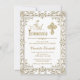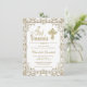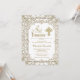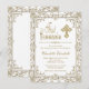 Cartons d'invitation de première communion blanc et or avec un beau fond en filigrane doré, une belle croix dorée et un texte élégant en écriture dorée avec séparateur. Ces élégantes invitations de première communion blanches et or sont facilement personnalisables pour votre événement en ajoutant simplement vos détails dans le style de police et la formulation de votre choix.