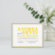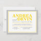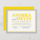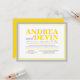 Cartes d'invitation pour une réception de mariage uniquement avec une typographie jaune et grise. (Étant donné la précision de l'alignement de ce design, il est conseillé de cliquer sur le bouton orange "Personnalisez-le !" pour déplacer et redimensionner le texte si nécessaire.) Ces invitations sont utilisées lorsque le couple organise un mariage de destination ou une petite cérémonie privée, et n'invite ses invités qu'à la célébration post-mariage, réception.