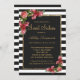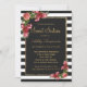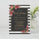Élégantes, chics et roses rouges et roses champêtres avec des rayures noires et blanches et un contour imprimé or faux, invitations pour une fête d'anniversaire pour les 16 ans. Ce design classique et sophistiqué est parfait pour la jeune fille d'anniversaire classe, branchée et élégante. Personnalisez avec votre propre message sur le devant et un monogramme personnalisé au dos. Conception entièrement en impression photo.