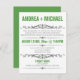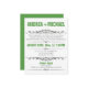 Cartons d'invitation modernes conçus pour les mariages où le couple a un mariage de destination ou une petite cérémonie de mariage privée, et n'invite les invités qu'à la célébration de la réception. La typographie sur le devant de ces invitations est conçue en polices vertes et grises, et le verso est un vert uni avec un texte blanc facultatif pour les informations de RSVP potentielles.