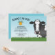 L'illustration originale de Destei d'une jolie vache blanche et noire, un peu d'herbe verte, un ciel bleu et une cloche de vache jaune. Personnalisez les zones de texte exemples avec les détails de votre événement.