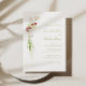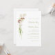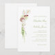 The invitation is adorned with a stunning cascading floral bouquet design, featuring watercolor illustrations of white anthurium, orchids and amaranthus. These delicate blooms, rendered in moss green and rich merlot hues, create a harmonious and inviting aesthetic that evokes the natural beauty of a flourishing garden.