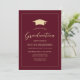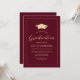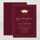 Cette simple invitation classique à la fête de remise de diplômes présente un casquette en carton de mortier en or sur un arrière - plan bordeaux. Le mot "Graduation" apparaît dans un script d'écriture manuscrite de couleur or. Customisez le texte sans serif avec le nom du diplômé et les détails de la fête à l'intérieur d'une mince bordure en or.