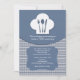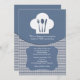 Une invitation bleue et blanche, avec un casquette de chef avec des ustensiles. Affiché comme une invitation au brunch post-mariage, il est également parfait pour un dîner de répétition ou un déjeuner de dames.
