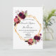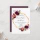 Devant : Un arrière - plan blanc avec un cadre géométrique en faux or. Décorée de fleurs bordeaux foncé et roses, de plumes roses et boho. Modèles pour Vos noms et les détails mariages. Les noms sont écrits avec un script de style écrit à la main, des lettres de couleur noire. Dos : Cassis, couleur arrière - plan violet foncé.