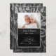 Élégante invitation pour les vingt-cinq ans de mariage sur fond de damas floral noir et argent avec une bordure accentuée d'argent pour célébrer cette date spéciale de vingt-cinq ans passés ensemble. Téléchargez une photo pour remplacer l'espace réservé. Personnalisez le texte du recto et du verso de l'invitation avec l'heure, la date, le lieu et d'autres informations.