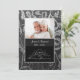 Élégante invitation de vingt-cinquième anniversaire de mariage sur fond de damassé floral noir et argent avec une bordure d'accentuation argentée pour célébrer cette date spéciale de vingt-cinq ans passés ensemble. Téléchargez une photo pour remplacer l'espace réservé. Personnalisez le texte avant et arrière de l'invitation avec l'heure, la date, le lieu et d'autres informations.