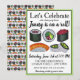 L'invitation présente une illustration originale au marqueur d'un assortiment de rouleaux de sushi maki japonais, avec LET'S CELEBRATE dans une police amusante. Idéal pour célébrer une remise de diplôme, une promotion ou tout autre événement de félicitations. Il suffit de personnaliser avec vos informations.