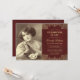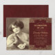 Une invitation de funérailles bordeaux vintage (« Célébration de la vie ») recommandée pour une femme. Dans la moitié gauche, il y a un espace réservé pour une photo sépia vintage que vous devez remplacer. Dans la moitié droite, le texte est écrit entre des bordures dorées baroques luxueusement décorées (en haut et en bas) sur fond rouge bordeaux. Le nom est écrit en écriture calligraphique, le reste en majuscules. Le message « Rejoignez-nous pour le » est arqué au-dessus du reste du texte.