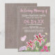 Invitation de mémorial funéraire rustique avec un fond en bois de style campagnard chic, des fleurs aquarelles, des papillons et un modèle de célébration de la vie facile à personnaliser.