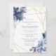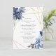 Des fleurs bleues poussiéreuses sont nichées dans l'angle d'un cadre géométrique doré. Les couleurs florales vont de bleu marine profond à bleu ciel doux. Les feuille sont également bleus