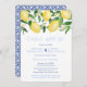 Cartes d'invitation de fête après le mariage "célébrez avec nous" avec des citrons aquarelles vibrants et des feuilles vertes brillantes avec de jolies fleurs, complétées par l'envers en carreaux bleus cobalt et blancs.