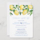 Cartes d'invitation de fête post-mariage "célébrez avec nous" avec des citrons aquarelles vibrants et des feuilles vertes brillantes avec de jolies fleurs, complétées par des carreaux bleus cobalt et blancs au verso.