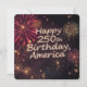 Des feux d'artifice vibrants éclatent dans un ciel sombre, célébrant une occasion importante. Le texte illuminé indique "Joyeux 250e anniversaire, Amérique," ajoutant une atmosphère festive.