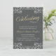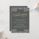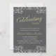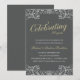 Une invitation élégante pour votre 50e anniversaire de mariage. Le texte "Célébrons 50 ans" est écrit dans une belle écriture dorée élégante sur un fond gris charbon. De belles volutes gris clair le long du haut et du bas de l'invitation encadrent le texte.