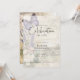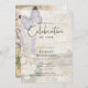 Elegant "Celebration of Life" Invitation featuring a serene vintage background of handwritten letters, a soft watercolor bridge scene, and delicate floral details with lavender sprigs, ivory peonies, and a graceful purple butterfly.