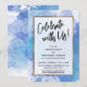 Sur un fond artistique désordonné qui présente des éclaboussures de peinture dans des nuances de bleu, de violet et de turquoise, j'ai placé un rectangle opaque bordé d'un faux doré métallisé pour mettre en valeur le texte. La partie supérieure comporte un calque de typographie simple qui indique "Célébrez avec nous !" dans une écriture manuscrite moderne et décontractée. Utilisez les champs du modèle pour ajouter vos propres détails. Toutes les couches ont été ajoutées séparément et laissées déverrouillées pour vous donner le contrôle sur le design. // 105 //