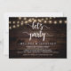 Faisons la fête, Carte d'annonce / d'invitation de mariage et fugace, sur fond de bois rustique de ferme, avec guirlande lumineuse. C'est parfait pour votre réception de mariage et fête de célébration après le mariage. Ajoutez vos détails avec la même police / lettrage.