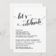 Voici un choix amusant et simple pour vos besoins de célébration après le mariage. Sur un fond modifiable, j'ai placé un graphique typographique qui indique "célébrons" avec une police de caractères élaborée ornée de cœurs. En dessous, vos informations apparaissent dans une police simple en majuscules. Utilisez les champs du modèle pour ajouter vos propres informations et cliquez pour personnaliser davantage si vous souhaitez apporter d'autres modifications. Changez la couleur de fond comme vous le souhaitez. Toutes les couches sont déverrouillées pour vous permettre de contrôler le positionnement et la taille comme vous le souhaitez.