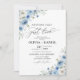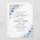 Invitation à la cérémonie de Mariage en ivoire bleu Dusty. Cette invitation à la douche de mariage élégante et élégante présente de magnifiques aquarelles peintes à la main de la couleur bleu outrepasse. Trouvez les articles correspondants dans la collection florale d'ivoire bleu Dusty.