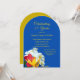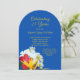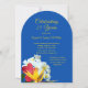 Invitation de renouvellement de vœux avec un bouquet tropical de fleurs hawaïennes. Cartes d'invitation bleu foncé avec texte imprimé moderne de couleur jaune doré. Les modèles facilitent la personnalisation avec le nombre d'années de mariage en haut. Un paragraphe supplémentaire est prévu pour les informations sur la réception, ou utilisez "réception à suivre", ou supprimez-le complètement. Un bouquet de plumeria / frangipanier blanc, d'hibiscus rose et d'oiseau-de-paradis jaune est le motif dans le coin inférieur. Le verso est de couleur or uni.