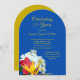 Invitation à une cérémonie de renouvellement de vœux avec un bouquet tropical de fleurs hawaïennes. Cartons d'invitation bleu foncé avec texte imprimé moderne de couleur jaune doré. Les modèles facilitent la personnalisation avec le nombre d'années de mariage en haut. Un paragraphe supplémentaire est prévu pour les informations sur la réception, ou utilisez "réception à suivre", ou supprimez-le complètement. Un bouquet de plumeria/frangipanier blanc, d'hibiscus rose et d'oiseau-de-paradis jaune est le motif dans le coin inférieur. Le verso est de couleur or uni.